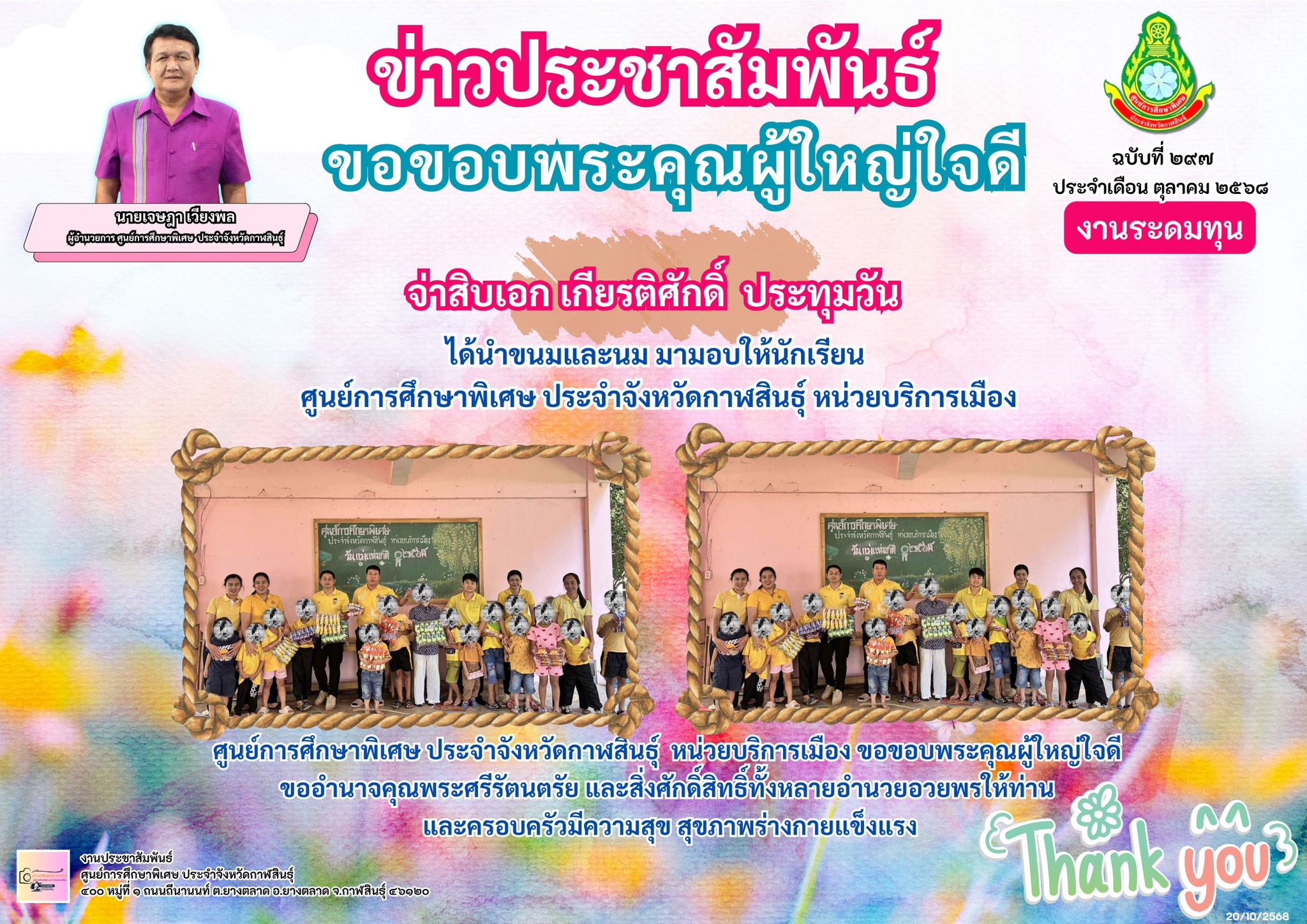 ศูนย์การศึกษาพิเศษ ประจำจังหวัดกาฬสินธ์ุ หน่วยบริการเมือง ขอขอบพระคุณผู้ใหญ่ใจดี จ่าสิบเอก เกียรติศักดิ์ ประทุมวัน ขออำนาจคุณพระศรีรัตนตรัย และสิ่งศักดิ์สิทธิ์ทั้งหลายอำนวยอวยพรให้ท่าน และครอบครัวมีความสุข สุขภาพร่างกายแข็งแรง