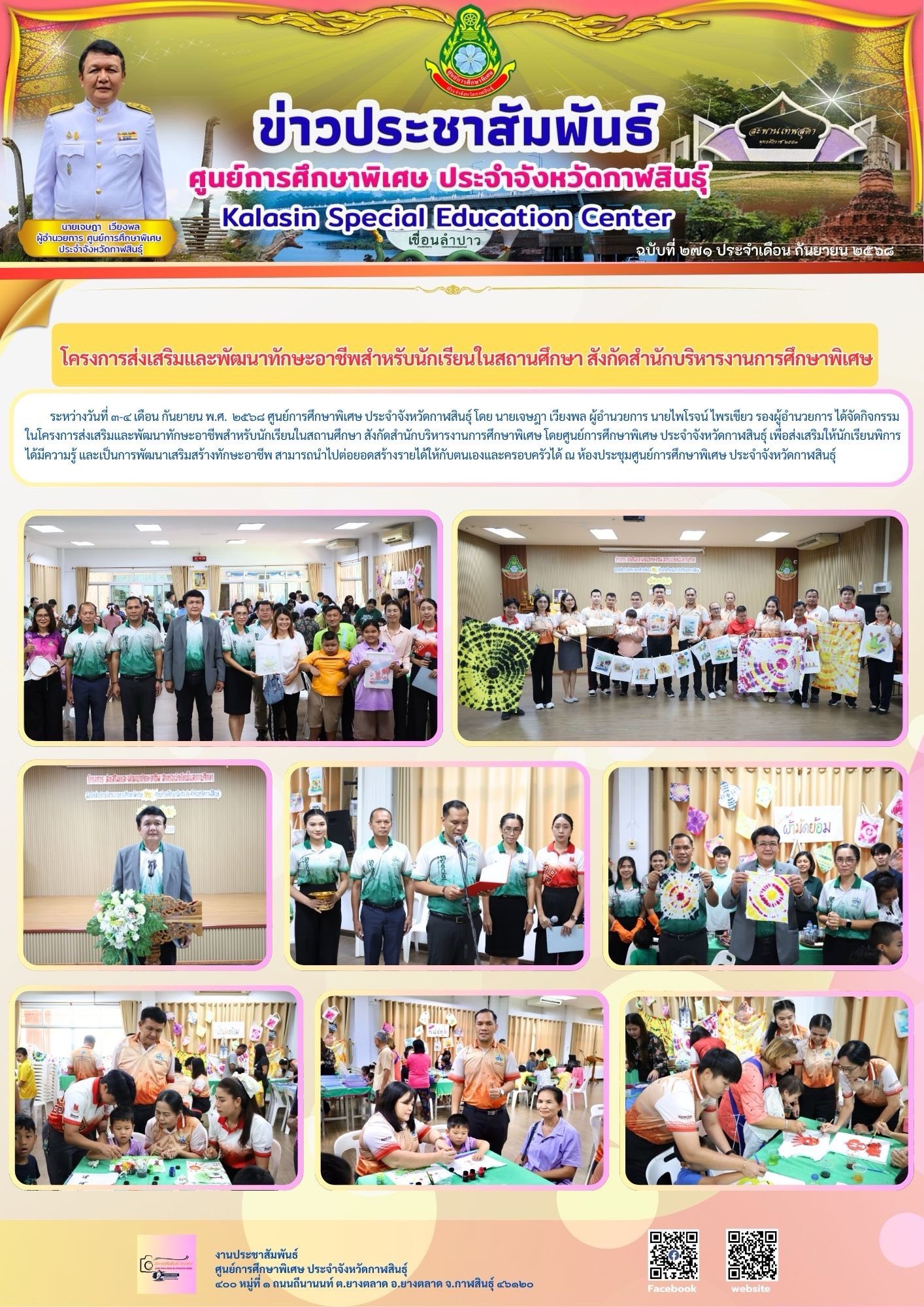 ระหว่างวันที่ 3 - 4 เดือน กันยายน พ.ศ. 2568 ศูนย์การศึกษาพิเศษ ประจำจังหวัดกาฬสินธุ์โดย นายเจษฎา เวียงพล ผู้อำนวยการ นายไพโรจน์ ไพรเขียว รองผู้อำนวยการ ได้จัดกิจกรรม ในโครงการส่งเสริมและพัฒนาทักษะอาชีพสำหรับนักเรียนในสถานศึกษา สังกัดสำนักบริหารงานการศึกษาพิเศษ โดยศูนย์การศึกษาพิเศษ ประจำจังหวัดกาฬสินธุ์ เพื่อส่งเสริมให้นักเรียนพิการได้มีความรู้ และเป็นการพัฒนาเสริมสร้างทักษะอาชีพ สามารถนำไปต่อยอดสร้างรายได้ให้กับตนเองและครอบครัวได้ ณ ห้องประชุมศูนย์การศึกษาพิเศษ ประจำจังหวัดกาฬสินธุ์