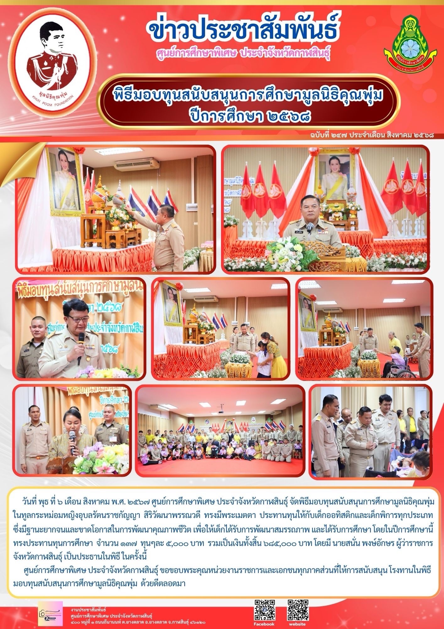 วันที่ พุธ ที่ 6 เดือน สิงหาคม พ.ศ. 2568 ศูนย์การศึกษาพิเศษ ประจำจังหวัดกาฬสินธุ์ จัดพิธีมอบทุนสนับสนุนการศึกษามูลนิธิคุณพุ่ม ในทูลกระหม่อมหญิงอุบลรัตนราชกัญญา สิริวัฒนาพรรณวดี ทรงมีพระเมตตาประทานทุนให้กับเด็กออทิสติกและเด็กพิการทุกประเภทซึ่งมีฐานะยากจนและขาดโอกาสในการพัฒนาคุณภาพชีวิต เพื่อให้เด็กได้รับการพัฒนาสมรรถภาพ และได้รับการศึกษา โดยในปีการศึกษานี้ ทรงประทานทุนการศึกษา จำนวน 137 ทุนๆละ 5,000 บาท รวมเป็นเงินทั้งสิ้น 685,000 บาท โดยมี นายสนั่น พงษ์อักษร ผู้ว่าราชการ จังหวัดกาฬสินธุ์ เป็นประธานในพิธีในครั้งนี้