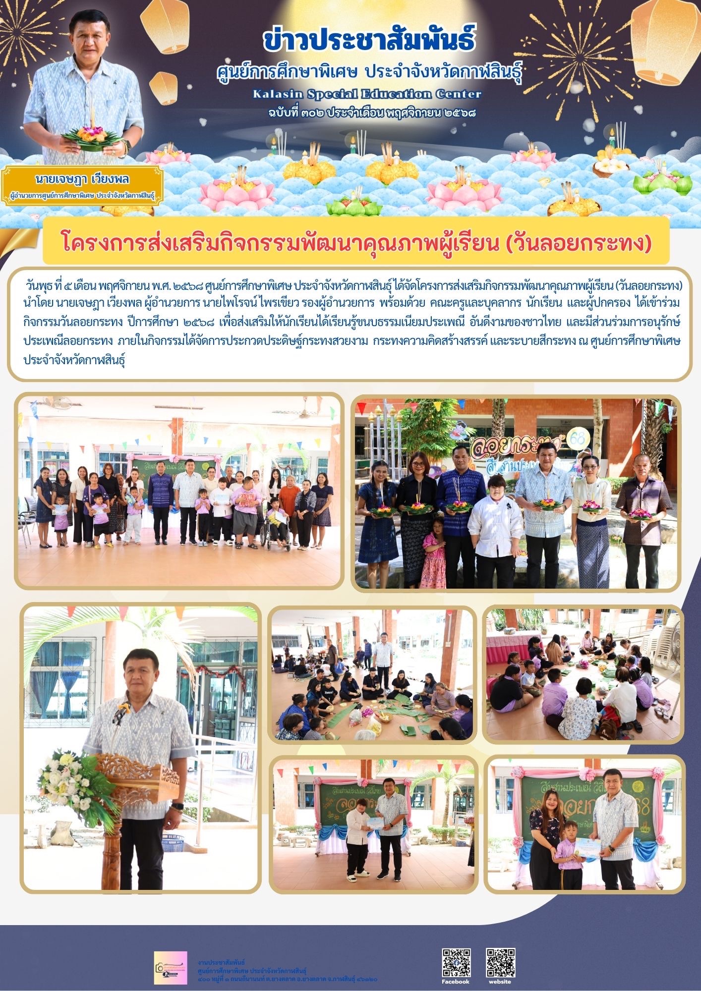 วันพุธ ที่ 5 เดือน พฤศจิกายน พ.ศ.2568 ศูนย์การศึกษาพิเศษ ประจำจังหวัดกาฬสินธุ์ ได้จัดโครงการส่งเสริมกิจกรรมพัฒนาคุณภาพผู้เรียน (วันลอยกระทง) นำโดย นายเจษฎา เวียงพล ผู้อำนวยการ นายไพโรจน์ ไพรเขียว รองผู้อำนวยการ พร้อมด้วย คณะครูและบุคลากร นักเรียน และผู้ปกครอง ได้เข้าร่วม กิจกรรมวันลอยกระทง ปีการศึกษา 2568 เพื่อส่งเสริมให้นักเรียนได้เรียนรู้ขนบธรรมเนียมประเพณี อันดีงามของชาวไทย และมีส่วนร่วมการอนุรักษ์ประเพณีลอยกระทง ภายในกิจกรรมได้จัดการประกวดประดิษฐ์กระทงสวยงาม กระทงความคิดสร้างสรรค์ และระบายสีกระทง ณ ศูนย์การศึกษาพิเศษ ประจำจังหวัดกาฬสินธุ์