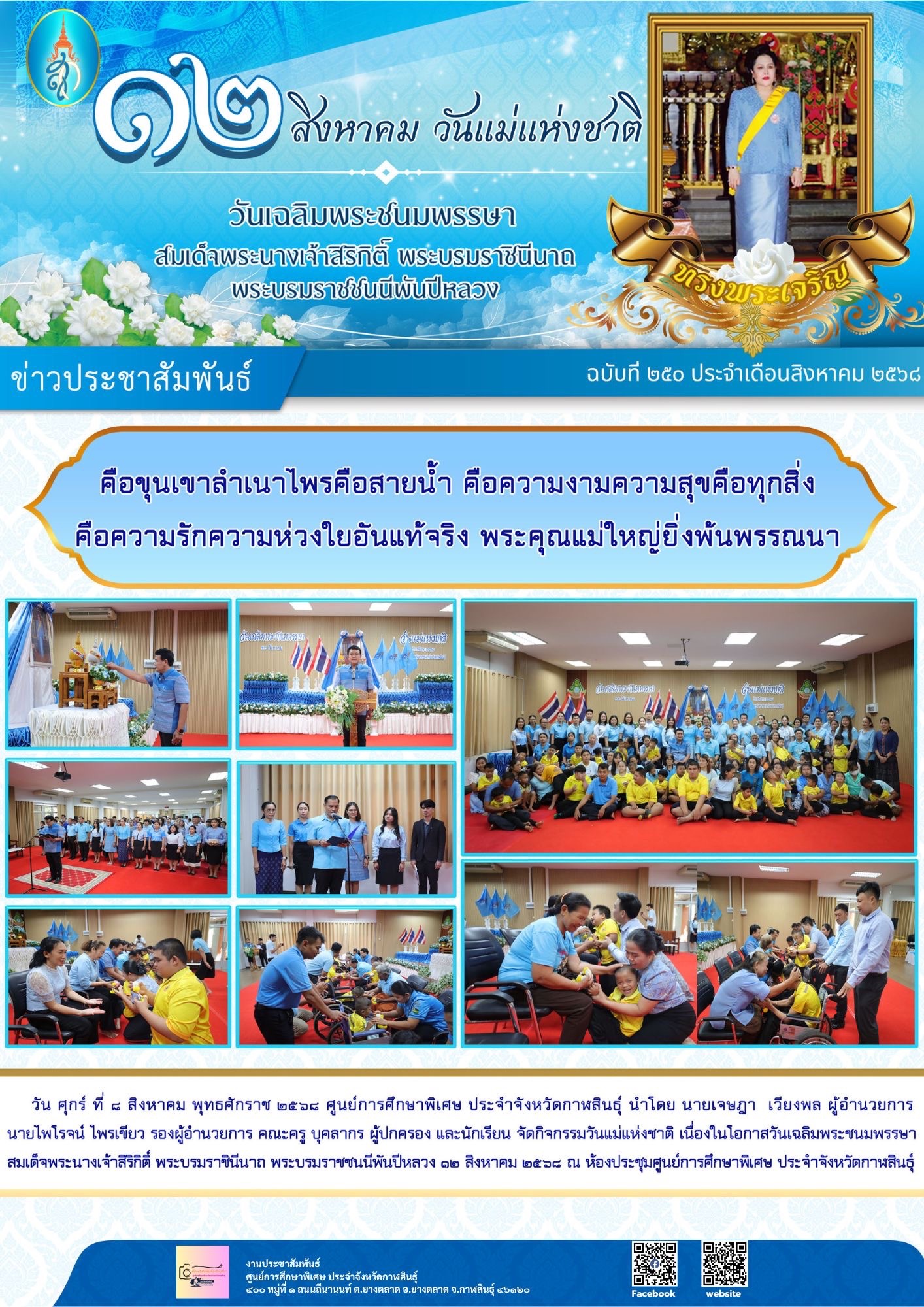 วัน ศุกร์ ที่ 8 สิงหาคม พุทธศักราช 2568 ศูนย์การศึกษาพิเศษ ประจำจังหวัดกาฬสินธุ์ นำโดย นายเจษฎา เวียงพล ผู้อำนวยการ นายไพโรจน์ไพรเขียว รองผู้อำนวยการ คณะครู บุคลากร ผู้ปกครอง และนักเรียน จัดกิจกรรมวันแม่แห่งชาติ เนื่องในโอกาสวันเฉลิมพระชนมพรรษา สมเด็จพระนางเจ้าสิริกิติ์ พระบรมราชินีนาถ พระบรมราชชนนีพันปีหลวง 12 สิงหาคม 2568 ณ ห้องประชุมศูนย์การศึกษาพิเศษ ประจำจังหวัดกาฬสินธุ์