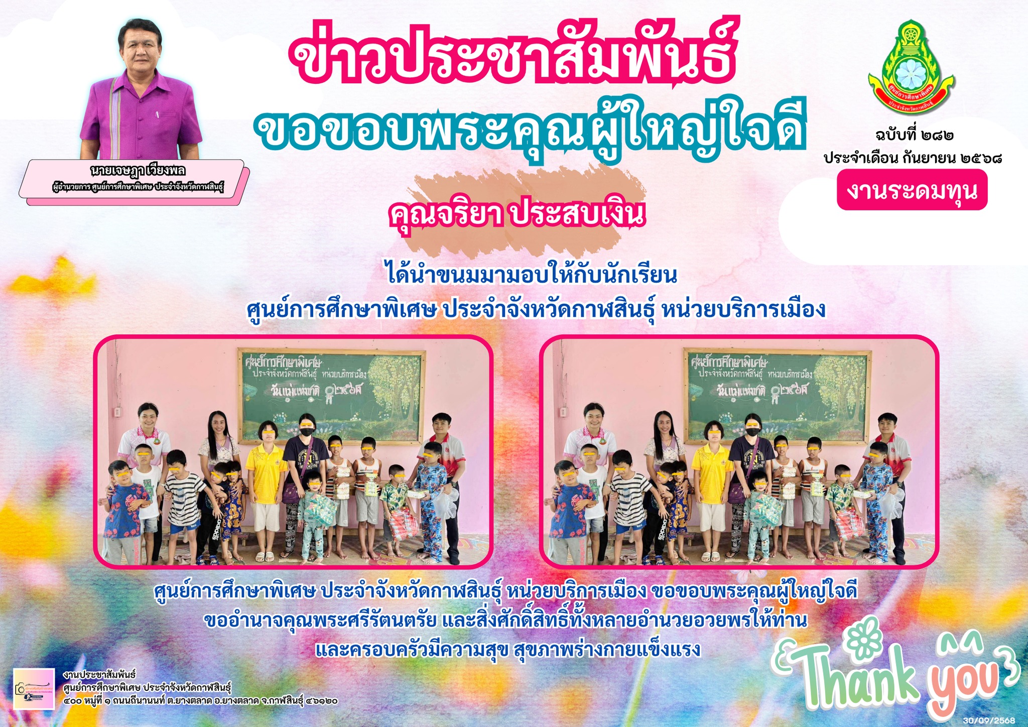 ศูนย์การศึกษาพิเศษ ประจำจังหวัดกาฬสินธ์ุ หน่วยบริการเมือง ขอขอบพระคุณผู้ใหญ่ใจดี คุณจริยา ประสบเงิน ขออำนาจคุณพระศรีรัตนตรัย และสิ่งศักดิ์สิทธิ์ทั้งหลายอำนวยอวยพรให้ท่าน และครอบครัวมีความสุข สุขภาพร่างกายแข็งแรง