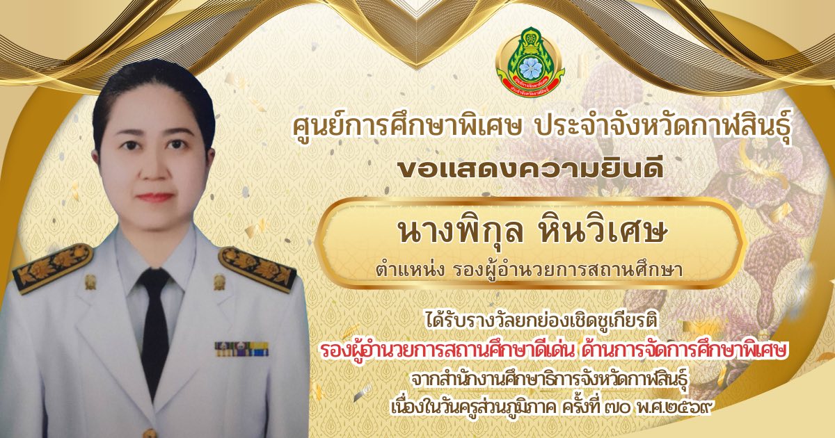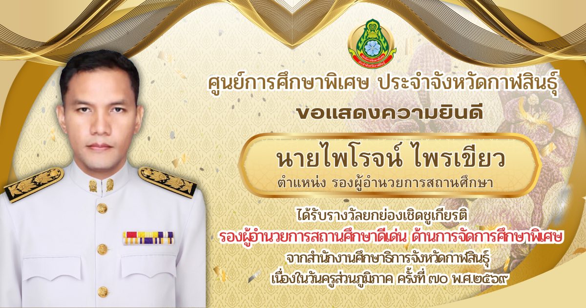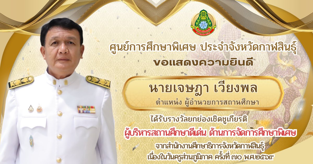 ศูนย์การศึกษาพิเศษ ประจำจังหวัดกาฬสินธุ์ ขอแสดงความยินดี คณะผู้บริหารสถานศึกษา ที่ได้รับรางวัลยกย่องเชิดชูเกียรติ ผู้บริหารสถานศึกษาดีเด่น ด้านการจัดการศึกษาพิเศษ จากสำนักงานศึกษาธิการจังหวัดกาฬสินธุ์