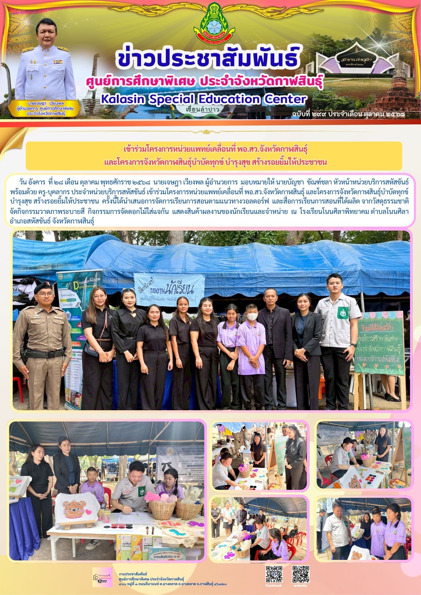 นายเจษฎา เวียงพล ผู้อำนวยการ มอบหมายให้ นายบัญชา ขัณฑ์ชลา หัวหน้าหน่วยบริกาiสหัสขันธ์ พร้อมด้วย ครู-บุคลากร ประจำหน่วยบริการสหัสขันธ์ เข้าร่วมโครงการหน่วยแพทย์เคลื่อนที่ พอ.สว.จังหวัดกาฬสินธุ์ และโครงการจังหวัดกาฬสินธุ์บำบัดทุกข์ บำรุงสุข สร้างรอยยิ้มให้ประชาชน ครั้งนี้ได้นำเสนอการจัดการเรียนการสอนตามแนวทางวอลดอร์ฟ และสื่อการเรียนการสอนที่ได้ผลิต จากวัสดุธรรมชาติ จัดกิจกรรมวาดภาพระบายสี กิจกรรมการจัดดอกไม้ใส่แจกัน แสดงสินค้าผลงานของนักเรียนและจำหน่าย ณ โรงเรียนโนนศิลาพิทยาคม ตำบลโนนศิลา อำเภอสหัสขันธ์ จังหวัดกาฬสินธุ์