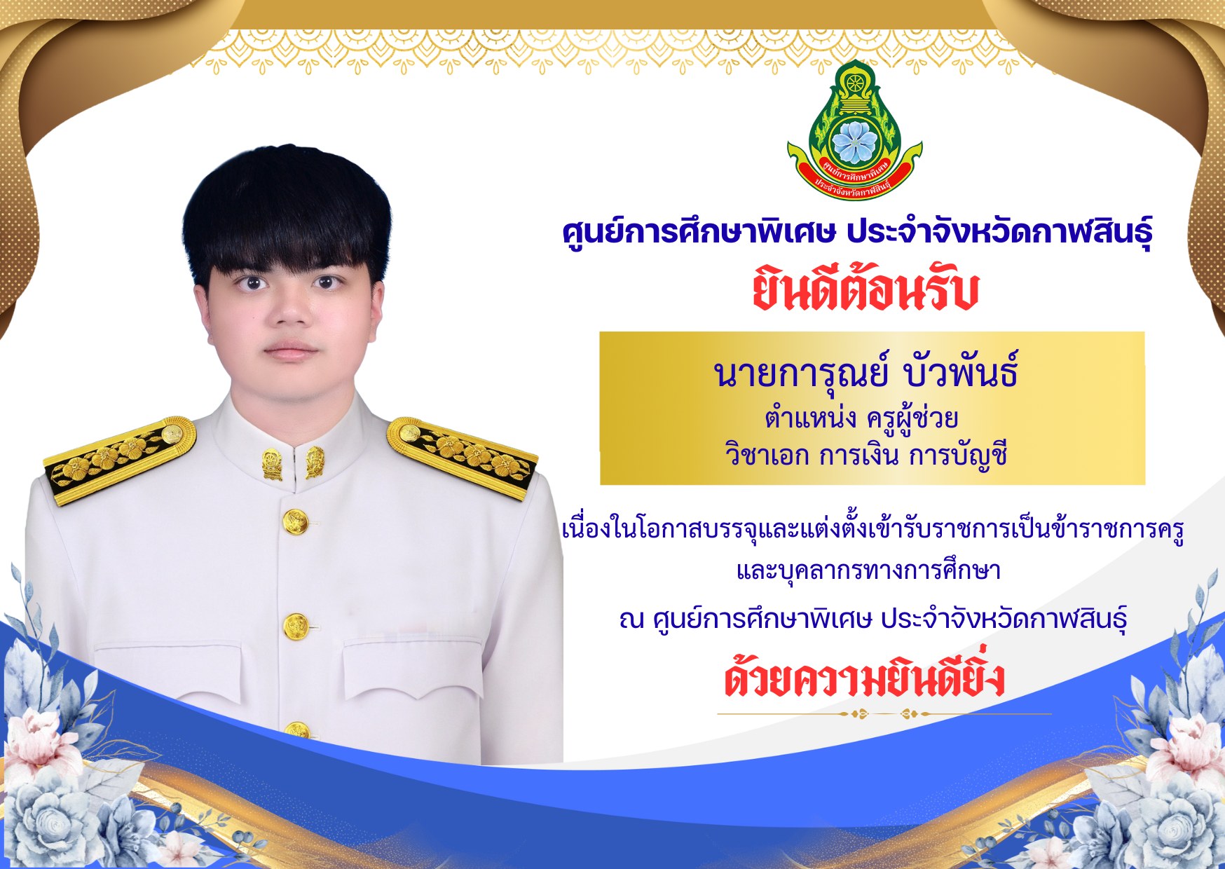 ศูนย์การศึกษาพิเศษ ประจำจังหวัดกาฬสินธุ์ ยินดีต้อนรับ นายการุณย์ บัวพันธ์ ตำแหน่ง ครูผู้ช่วย วิชาเอก การเงิน การบัญชี เนื่องในโอกาสบรรจุและแต่งตั้งเข้ารับราชการเป็นข้าราชการครูและบุคลากรทางการศึกษา ณ ศูนย์การศึกษาพิเศษ ประจำจังหวัดกาฬสินธุ์ ด้วยความยินดียิ่ง