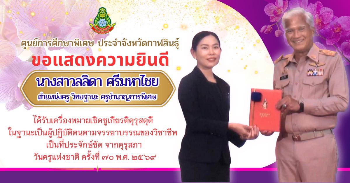 ศูนย์การศึกษาพิเศษ ประจำจังหวัดกาฬสินธุ์ ขอแสดงความยินดี นางสาวลลิดา ศรีมหาไชยตําแหน่งครู วิทยฐานะ ครูชํานาญการพิเศษ ได้รับเครื่องหมายเชิดชูเกียรติคุรุสดุดี ในฐานะเป็นผู้ปฏิบัติตนตามจรรยาบรรณของวิชาชีพ เป็นที่ประจักษ์ชัด จากคุรุสภา เนื่องในวันครูแห่งชาติ ครั้งที่ 70 พ.ศ.2569 ด้วยความยินดียิ่ง