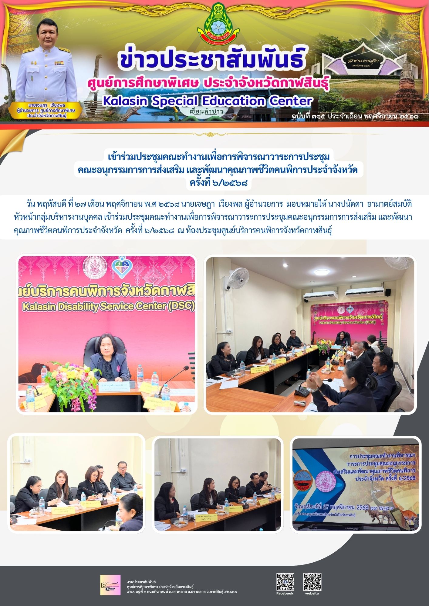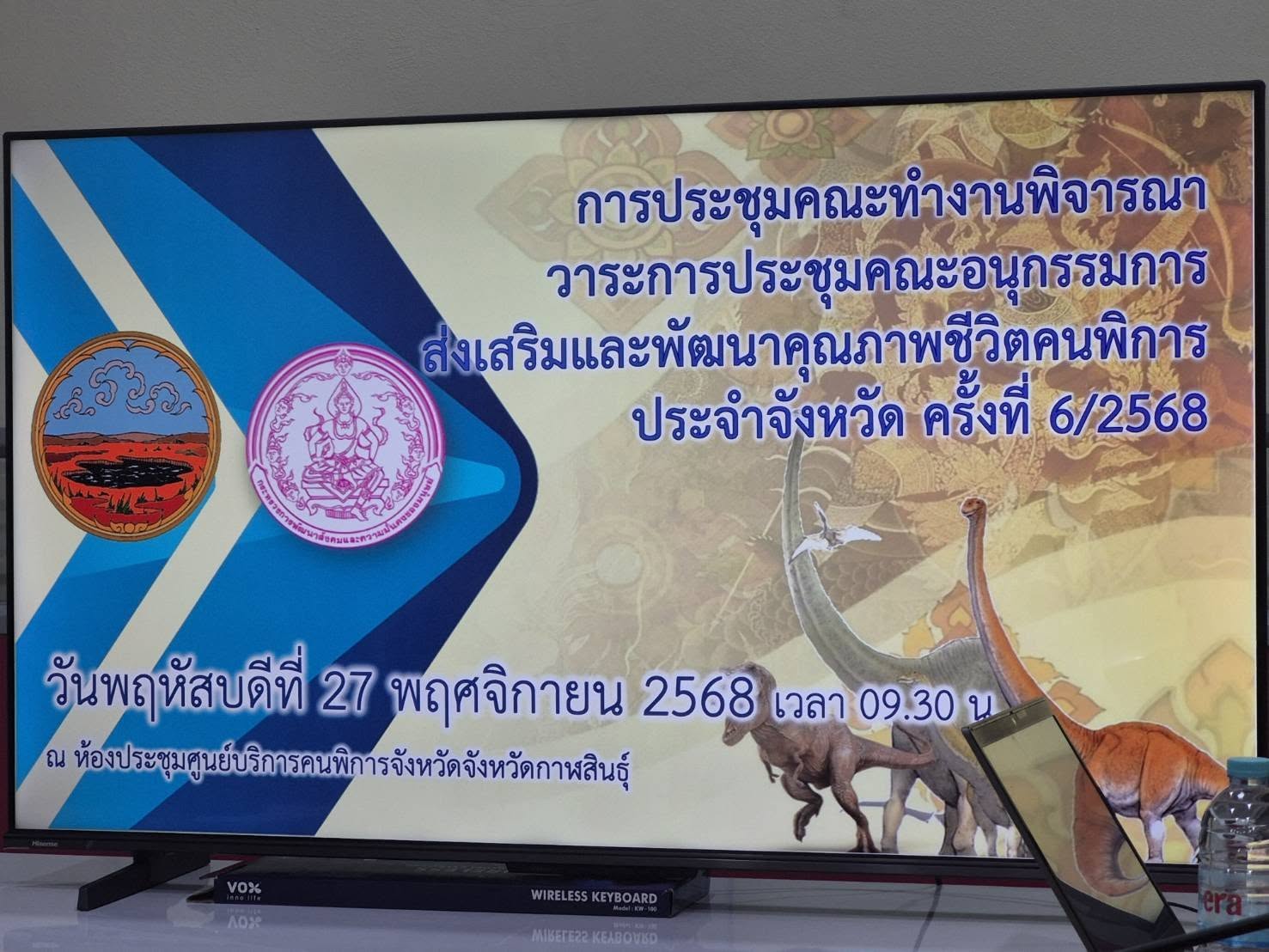 วัน พฤหัสบดี ที่ 27 เดือน พฤศจิกายน พ.ศ 2568 นางปนัดดา อามาตย์สมบัติ หัวหน้ากลุ่มบริหารงานบุคคล เข้าร่วมประชุมคณะทำงานเพื่อการพิจารณาวาระการประชุมคณะอนุกรรมการการส่งเสริม และพัฒนา คุณภาพชีวิตคนพิการประจำจังหวัด ครั้งที่ 6/2568 ณ ห้องประชุมศูนย์บริการคนพิการจังหวัดกาฬสินธุ์
