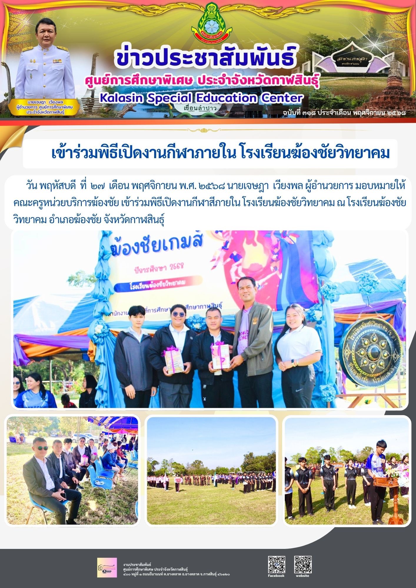 วันพฤหัสบดี ที่ 27 เดือน พฤศจิกายน พ.ศ. 2568 คณะครูหน่วยบริการฆ้องชัย เข้าร่วมพิธีเปิดงานกีฬาสีภายในโรงเรียนฆ้องชัยวิทยาคม ณ โรงเรียนฆ้องชัยวิทยาคม อำเภอฆ้องชัย จังหวัดกาฬสินธุ์