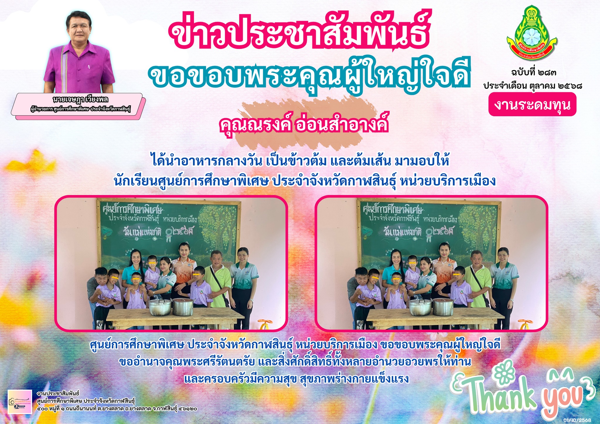 ศูนย์การศึกษาพิเศษ ประจำจังหวัดกาฬสินธ์ุ หน่วยบริการเมือง ขอขอบพระคุณผู้ใหญ่ใจดี คุณณรงค์ อ่อนสำอางค์ ขออำนาจคุณพระศรีรัตนตรัย และสิ่งศักดิ์สิทธิ์ทั้งหลายอำนวยอวยพรให้ท่าน และครอบครัวมีความสุข สุขภาพร่างกายแข็งแรง