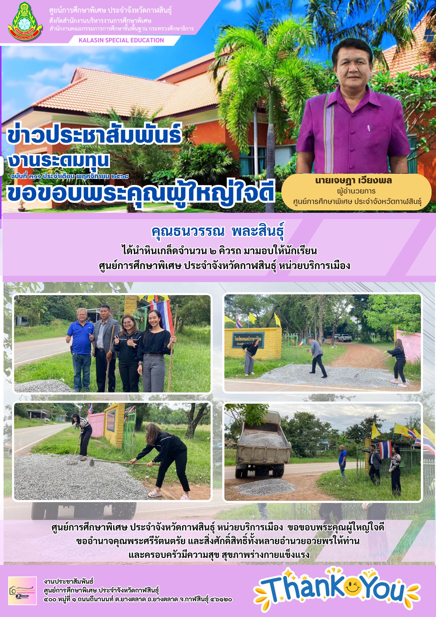 ศูนย์การศึกษาพิเศษ ประจำจังหวัดกาฬสินธ์ุ หน่วยบริการเมือง ขอขอบพระคุณผู้ใหญ่ใจดี คุณธนวรรณ พละสินธุ์ ขออำนาจคุณพระศรีรัตนตรัย และสิ่งศักดิ์สิทธิ์ทั้งหลายอำนวยอวยพรให้ท่าน และครอบครัวมีความสุข สุขภาพร่างกายแข็งแรง