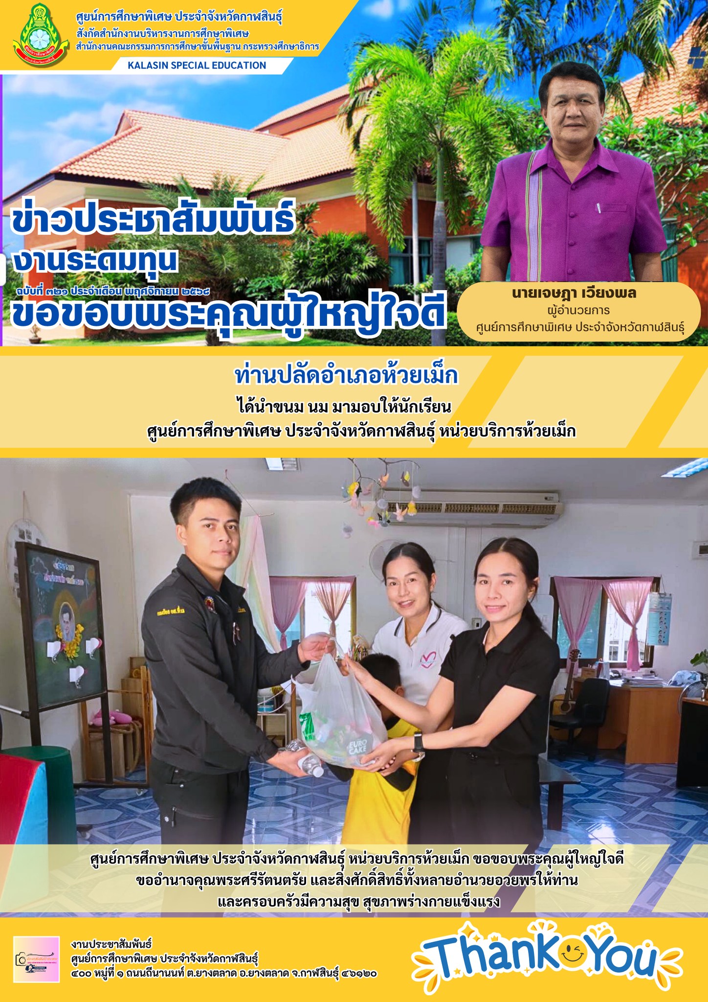 ศูนย์การศึกษาพิเศษ ประจำจังหวัดกาฬสินธ์ุ หน่วยบริการห้วยเม็ก ขอขอบพระคุณผู้ใหญ่ใจดี ท่านปลัดอำเภอห้วยเม็ก ขออำนาจคุณพระศรีรัตนตรัย และสิ่งศักดิ์สิทธิ์ทั้งหลายอำนวยอวยพรให้ท่าน และครอบครัวมีความสุข สุขภาพร่างกายแข็งแรง