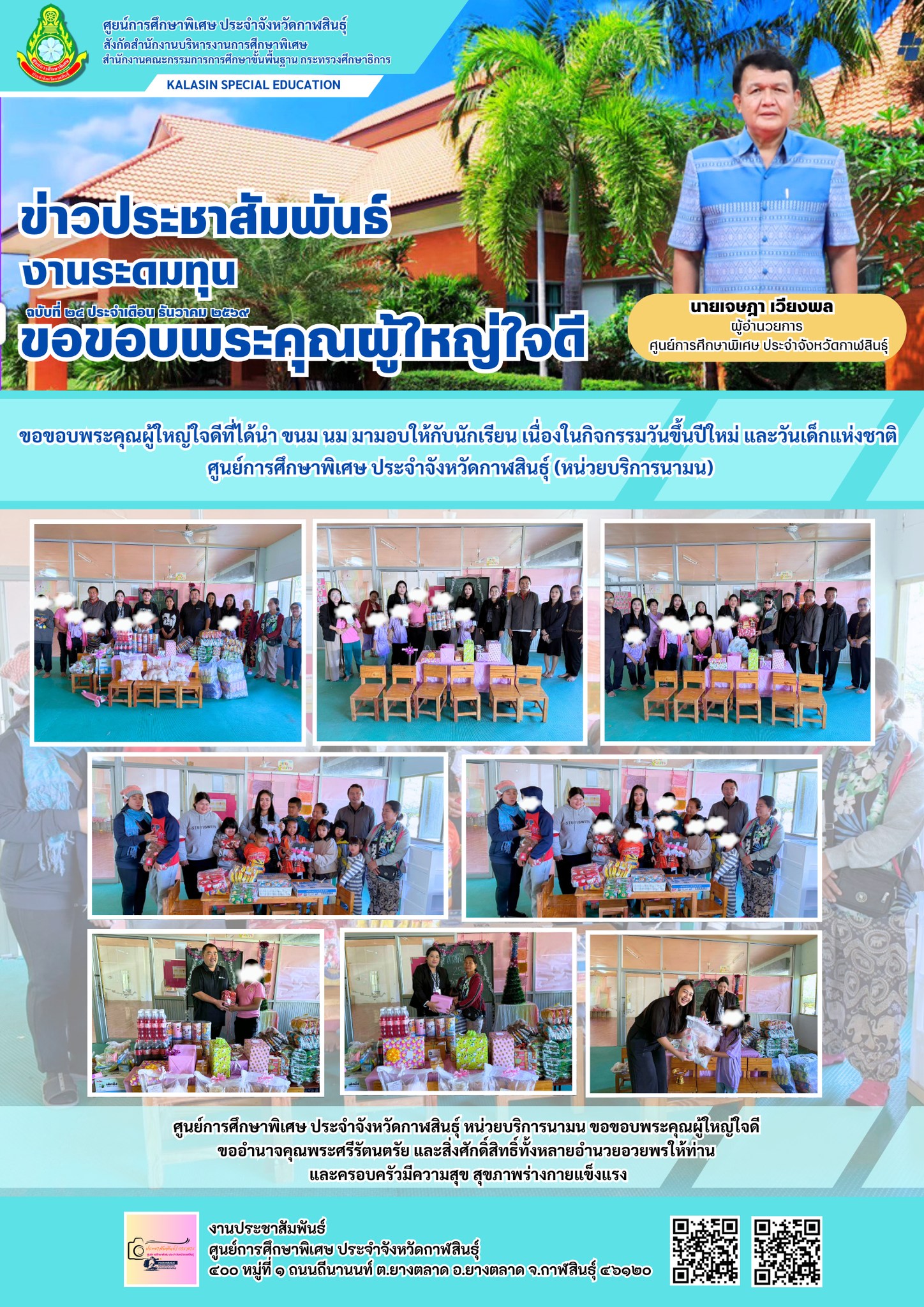 ขอขอบพระคุณผู้ใหญ่ใจดีที่ได้นำ ขนม นม มามอบให้กับนักเรียน เนื่องในกิจกรรมวันขึ้นปีใหม่ และวันเด็กแห่งชาติศูนย์การศึกษาพิเศษ ประจำจังหวัดกาฬสินธ์ุ (หน่วยบริการนามน)