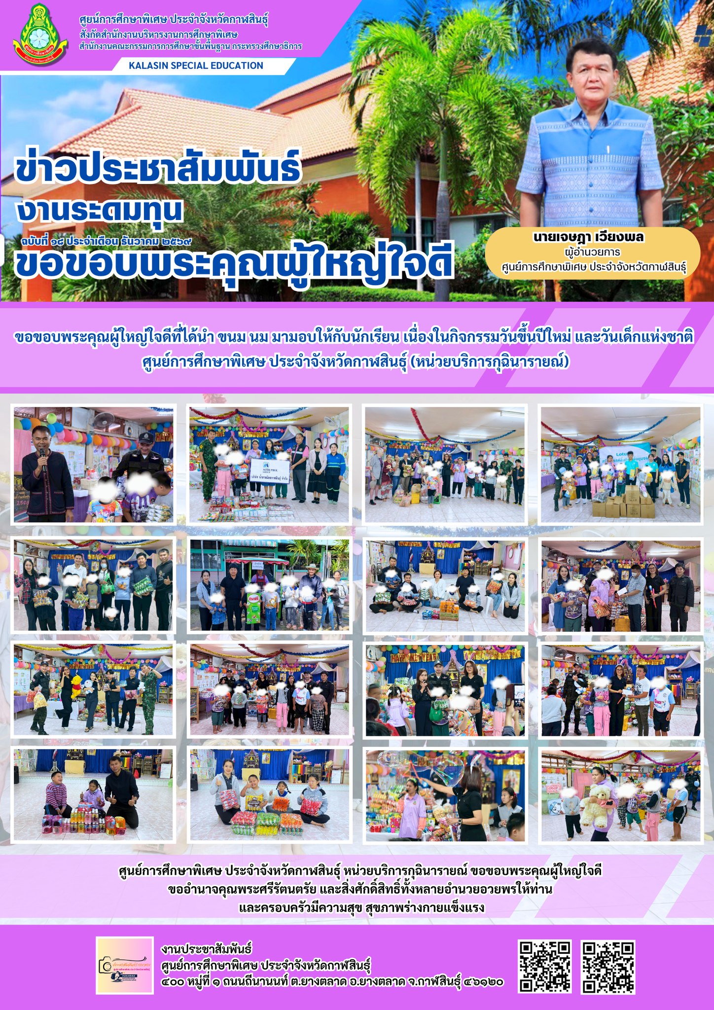 ขอขอบพระคุณผู้ใหญ่ใจดีที่ได้นำ ขนม นม มามอบให้กับนักเรียน เนื่องในกิจกรรมวันขึ้นปีใหม่ และวันเด็กแห่งชาติศูนย์การศึกษาพิเศษ ประจำจังหวัดกาฬสินธ์ุ (หน่วยบริการกุฉินารายณ์) ขอขอบพระคุณผู้ใหญ่ใจดี ขออำนาจคุณพระศรีรัตนตรัย และสิ่งศักดิ์สิทธิ์ทั้งหลายอำนวยอวยพรให้ท่าน และครอบครัวมีความสุข สุขภาพร่างกายแข็งแรง