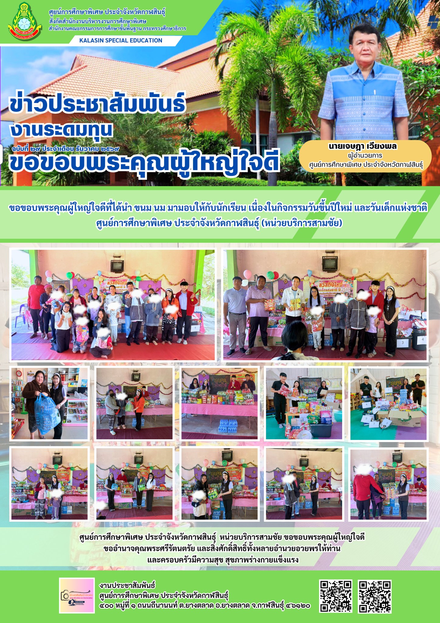 ขอขอบพระคุณผู้ใหญ่ใจดีที่ได้นำ ขนม นม มามอบให้กับนักเรียน เนื่องในกิจกรรมวันขึ้นปีใหม่ และวันเด็กแห่งชาติศูนย์การศึกษาพิเศษ ประจำจังหวัดกาฬสินธ์ุ (หน่วยบริการฆ้องชัย)