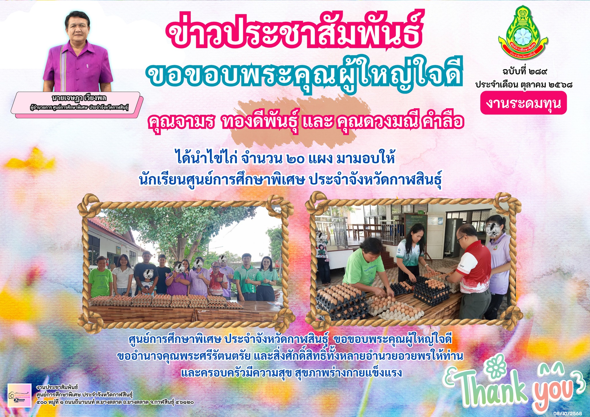 คุณจามร ทองดีพันธุ์ และ คุณดวงมณี คำลือ ได้นำไข่ไก่ จำนวน ๒o แผง มามอบให้นักเรียนศูนย์การศึกษาพิเศษ ประจำจังหวัดกาฬสินธ์ุ