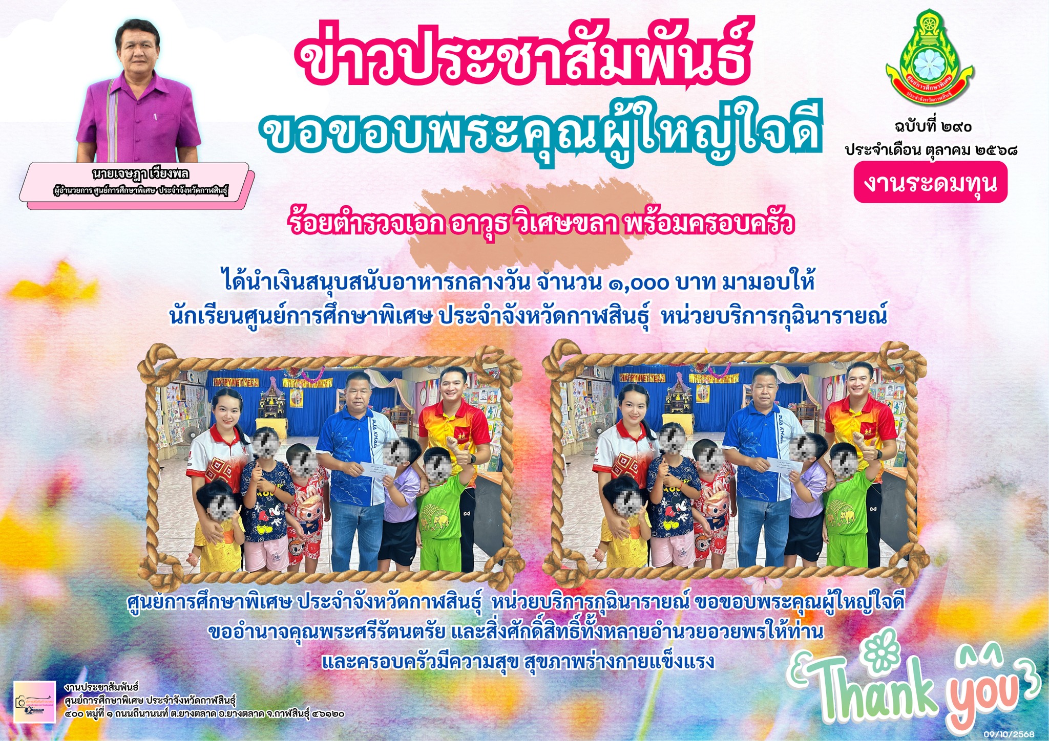 ร้อยตำรวจเอก อาวุธ วิเศษขลา พร้อมครอบครัว ได้นำเงินสนุบสนับอาหารกลางวัน จำนวน 1,000 บาท มามอบให้นักเรียนศูนย์การศึกษาพิเศษ ประจำจังหวัดกาฬสินธ์ุ หน่วยบริการกุฉินารายณ์