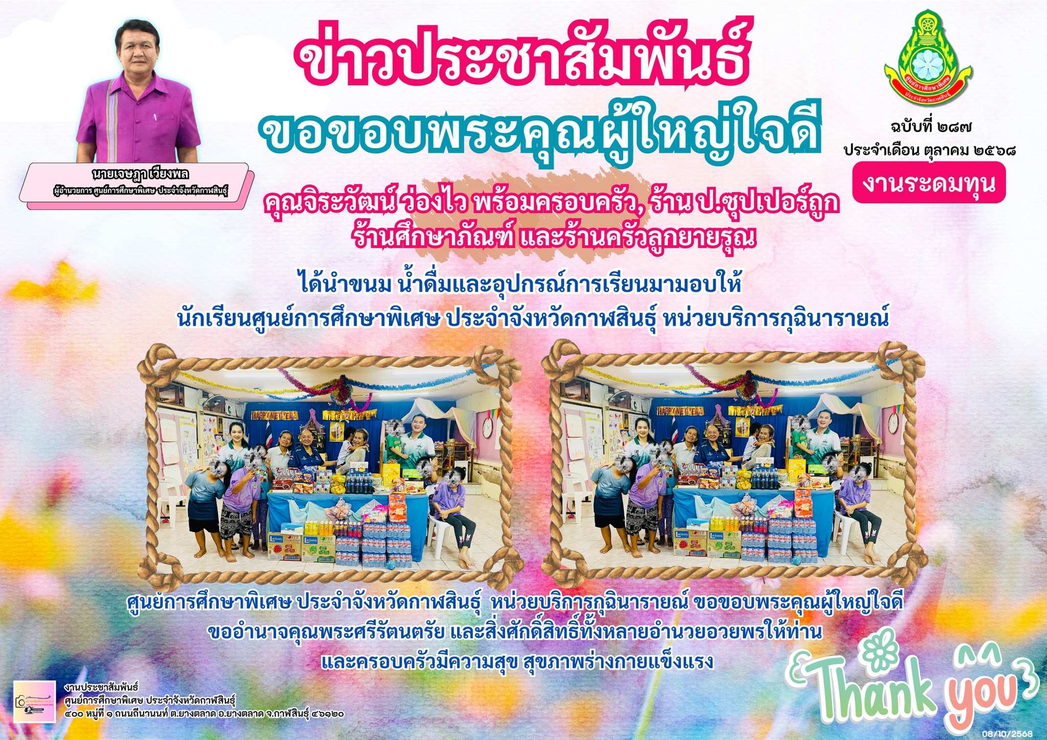 คุณจิระวัฒน์ ว่องไว พร้อมครอบครัว ร้าน ป.ซุปเปอร์ถูก ร้านศึกษาภัณฑ์ และร้านครัวลูกยายรุณ ได้นำขนมน้ำดื่มและอุปกรณ์การเรียนมามอบให้นักเรียนศูนย์การศึกษาพิเศษ ประจำจังหวัดกาฬสินธ์ุ หน่วยบริการกุฉินารายณ์