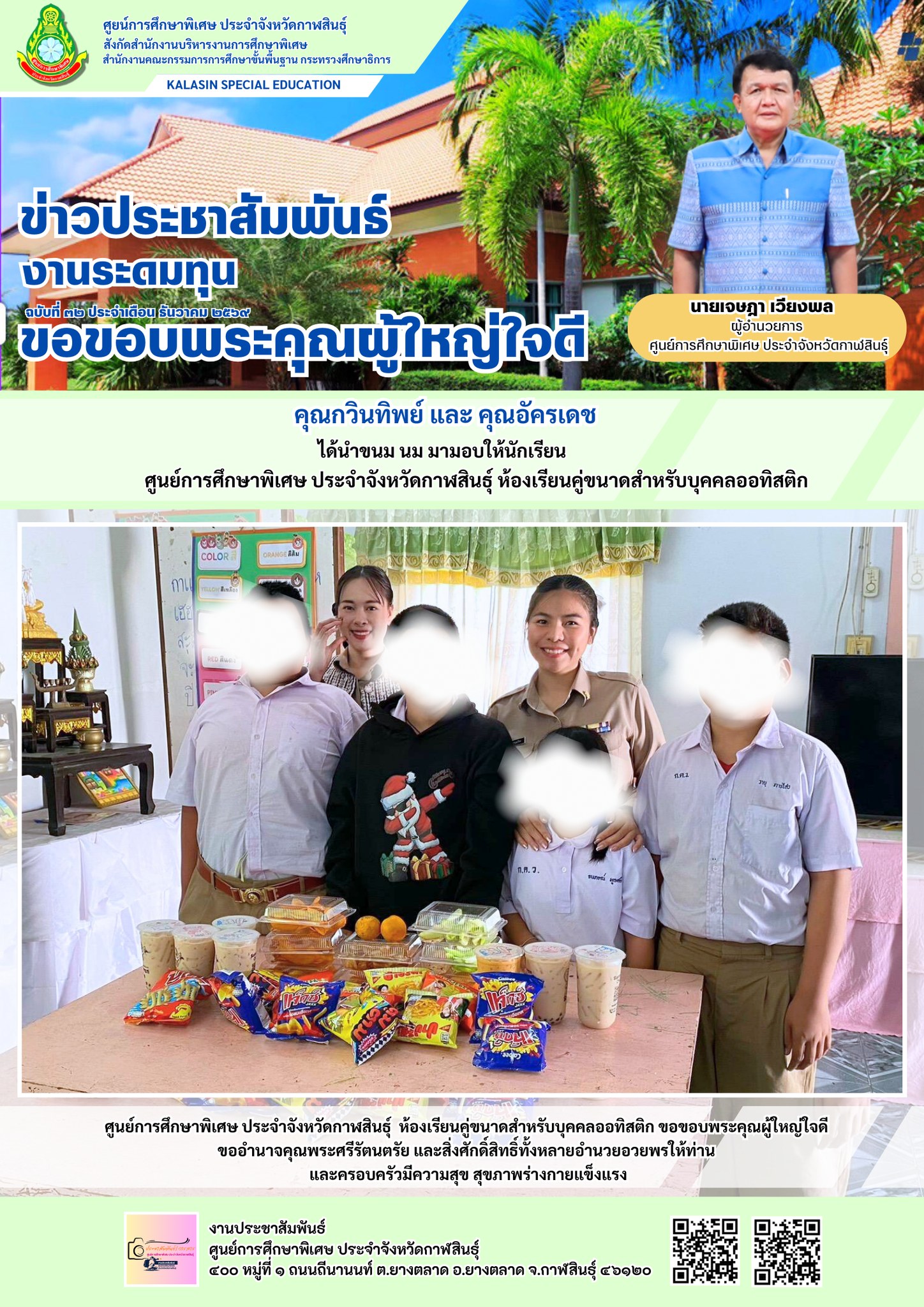 ศูนย์การศึกษาพิเศษ ประจำจังหวัดกาฬสินธ์ุ ห้องเรียนคู่ขนาดสำหรับบุคคลออทิสติก ขอขอบพระคุณผู้ใหญ่ใจดี ขออำนาจคุณพระศรีรัตนตรัย และสิ่งศักดิ์สิทธิ์ทั้งหลายอำนวยอวยพรให้ท่าน และครอบครัวมีความสุข สุขภาพร่างกายแข็งแรง