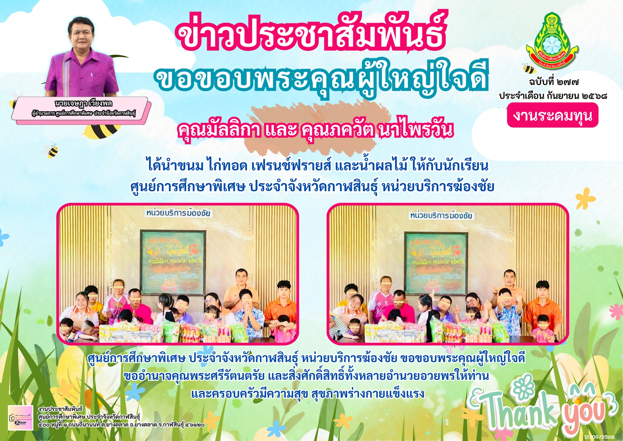 ศูนย์การศึกษาพิเศษ ประจำจังหวัดกาฬสินธ์ุ หน่วยบริการฆ้องชัย ขอขอบพระคุณผู้ใหญ่ใจดี คุณมัลลิกา และ คุณภควัต นาไพรวัน ขออำนาจคุณพระศรีรัตนตรัย และสิ่งศักดิ์สิทธิ์ทั้งหลายอำนวยอวยพรให้ท่าน และครอบครัวมีความสุข สุขภาพร่างกายแข็งแรง