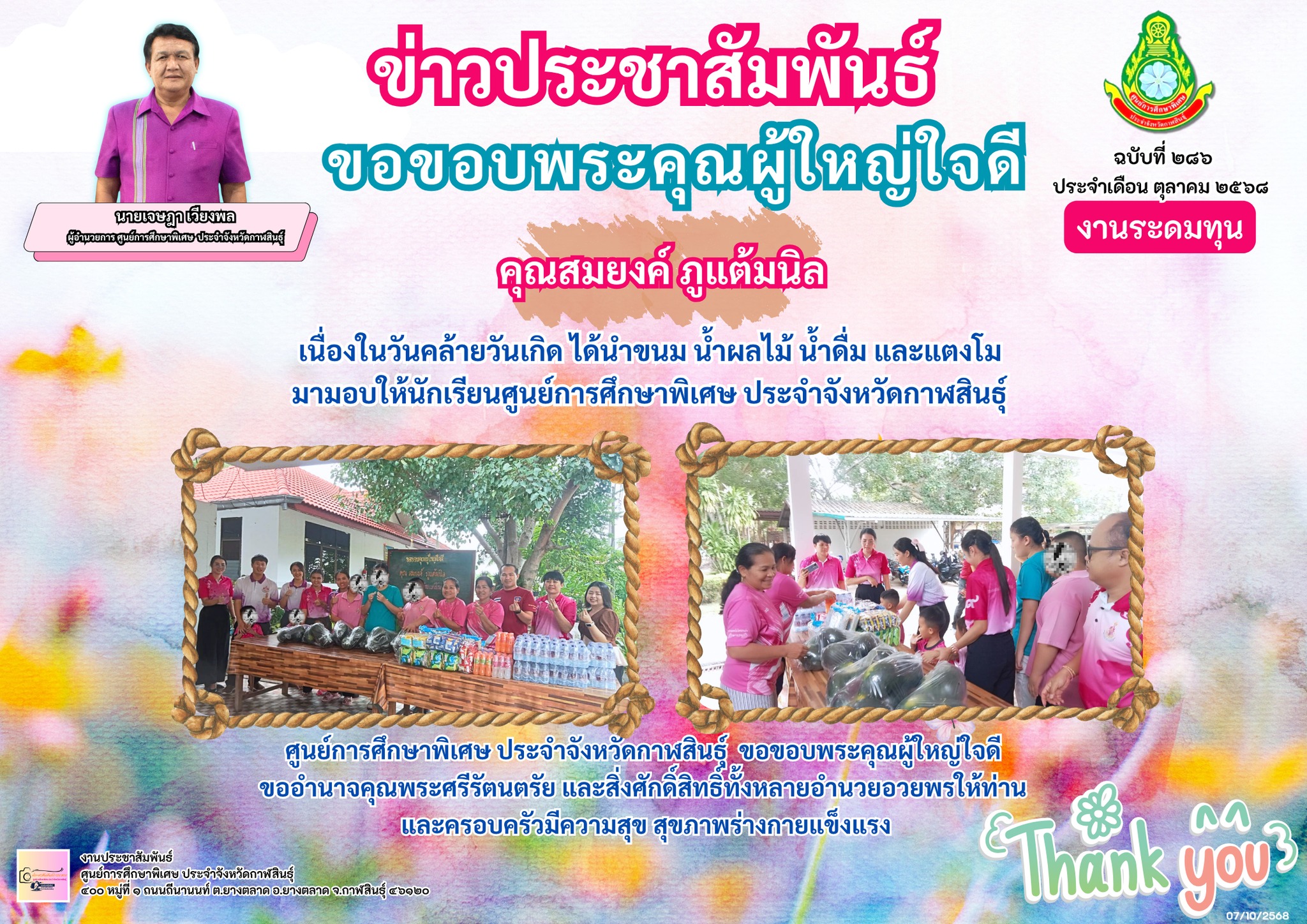ศูนย์การศึกษาพิเศษ ประจำจังหวัดกาฬสินธ์ุ ขอขอบพระคุณผู้ใหญ่ใจดี คุณสมยงค์ ภูแต้มนิล ขออำนาจคุณพระศรีรัตนตรัย และสิ่งศักดิ์สิทธิ์ทั้งหลายอำนวยอวยพรให้ท่าน และครอบครัวมีความสุข สุขภาพร่างกายแข็งแรง