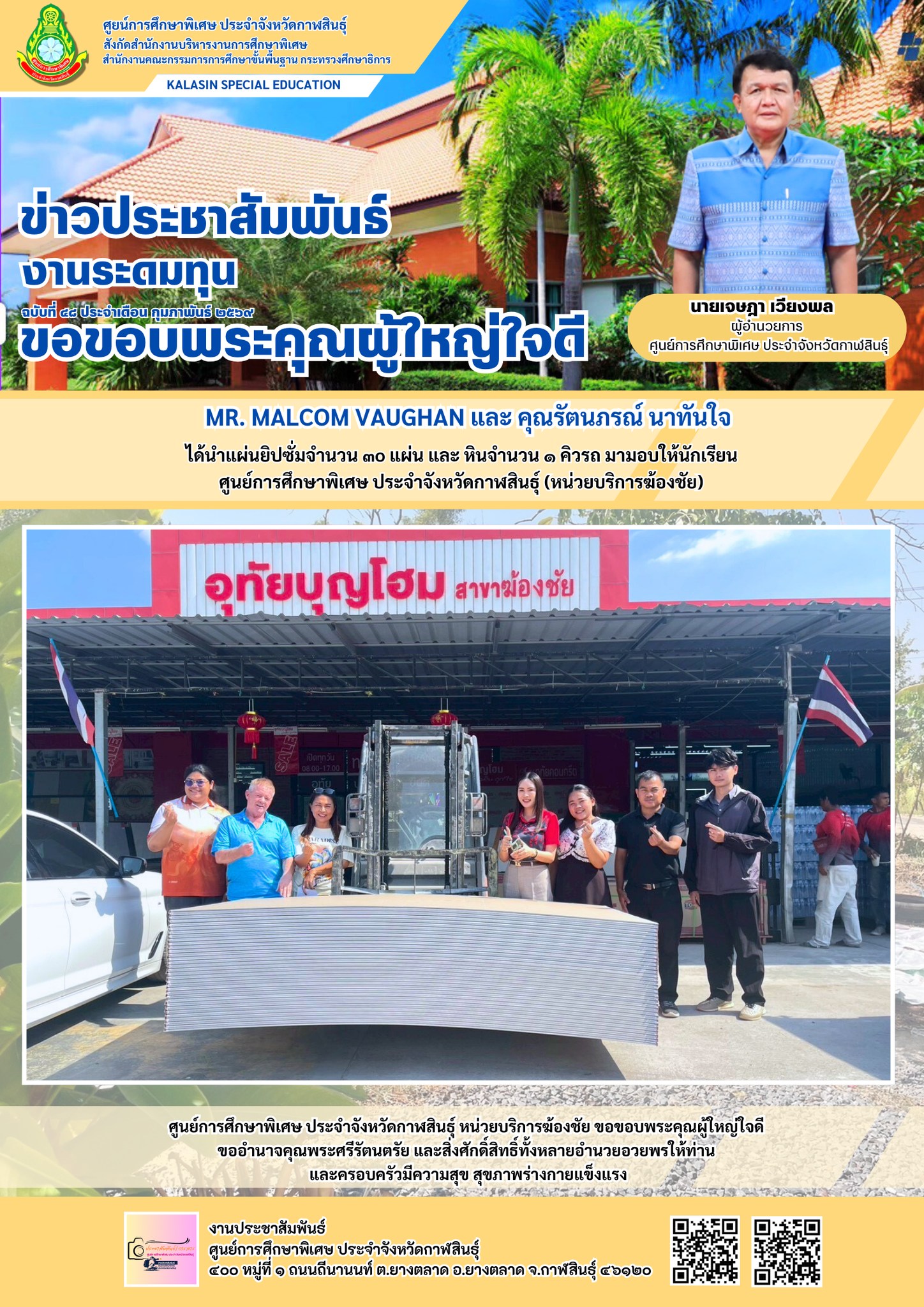 Mr. Malcom Vaughan และ คุณรัตนภรณ์ นาทันใจ ได้นำแผ่นยิปซั่มจำนวน 30 แผ่น และ หินจำนวน 1 คิวรถ มามอบให้นักเรียน ศูนย์การศึกษาพิเศษ ประจำจังหวัดกาฬสินธ์ุ (หน่วยบริการฆ้องชัย)