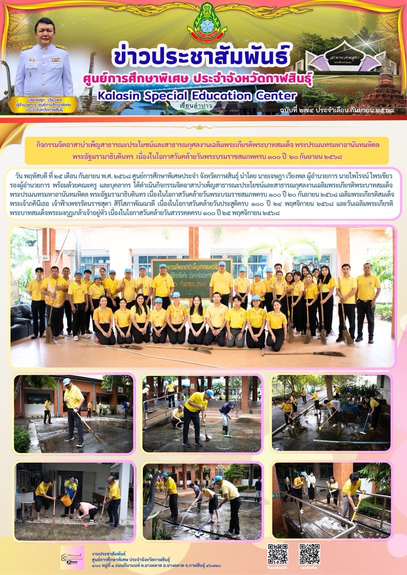 วัน พฤหัสบดี ที่ 25 เดือน กันยายน พ.ศ. 2568 ศูนย์การศึกษาพิเศษประจำ จังหวัดกาฬสินธุ์ นำโดย นายเจษฎา เวียงพล ผู้อำนวยการ นายไพโรจน์ ไพรเขียว รองผู้อำนวยการ พร้อมด้วยคณะครู และบุคลากร ได้ดำเนินกิจกรรมจิตอาสาบำเพ็ญสาธารณะประโยชน์และสาธารณกุศลงานเฉลิมพระเกียรติพระบาทสมเด็จพระปรเมนทรมหาอานันทมหิดล พระอัฐมรามาธิบดินทร เนื่องในโอกาสวันคล้ายวันพระบรมราชสมภพครบ 100 ปี 20 กันยายน 2568