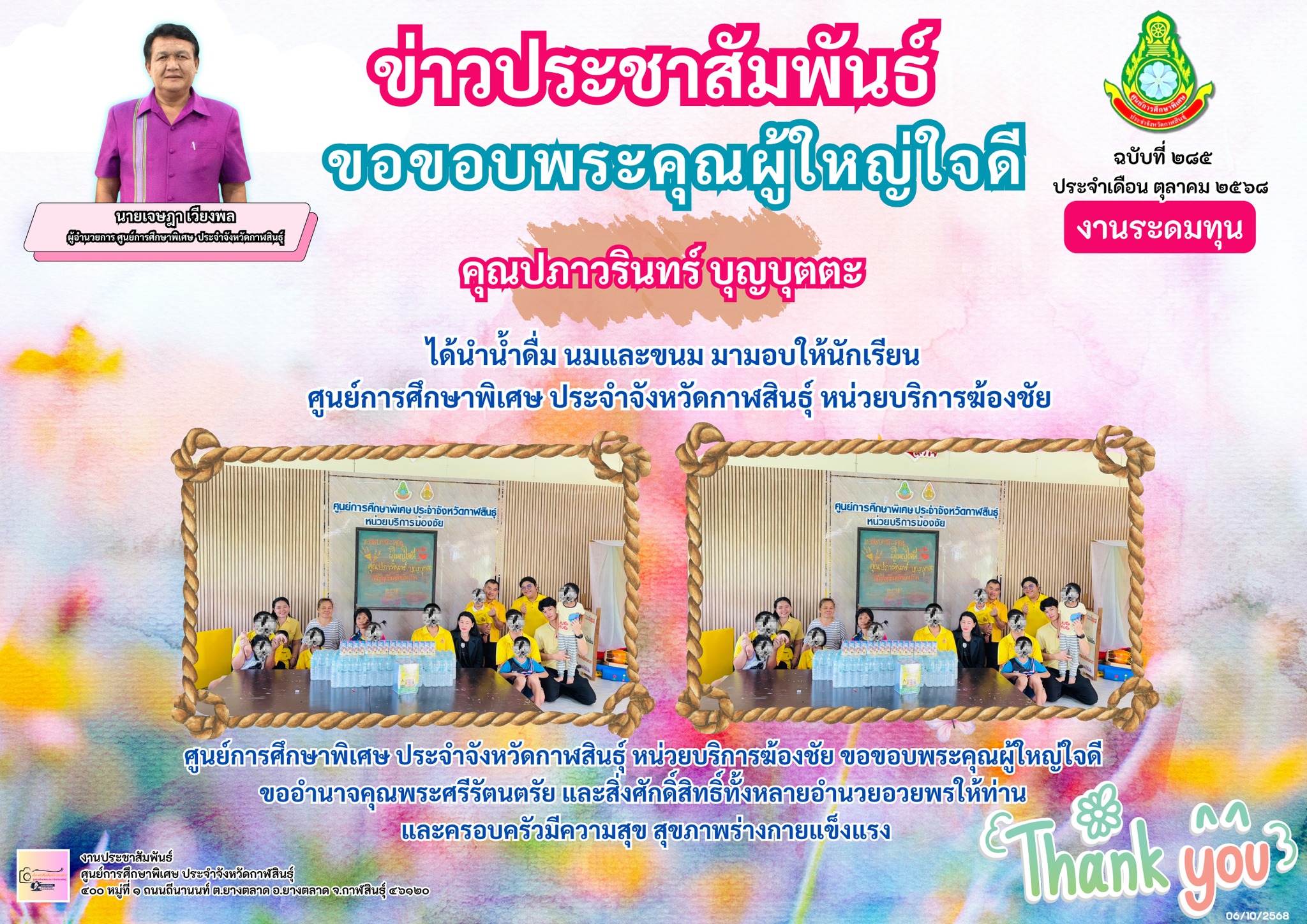 ศูนย์การศึกษาพิเศษ ประจำจังหวัดกาฬสินธ์ุ หน่วยบริการฆ้องชัย ขอขอบพระคุณผู้ใหญ่ใจดี คุณปภาวรินทร์ บุญบุตตะ ขออำนาจคุณพระศรีรัตนตรัย และสิ่งศักดิ์สิทธิ์ทั้งหลายอำนวยอวยพรให้ท่าน และครอบครัวมีความสุข สุขภาพร่างกายแข็งแรง
