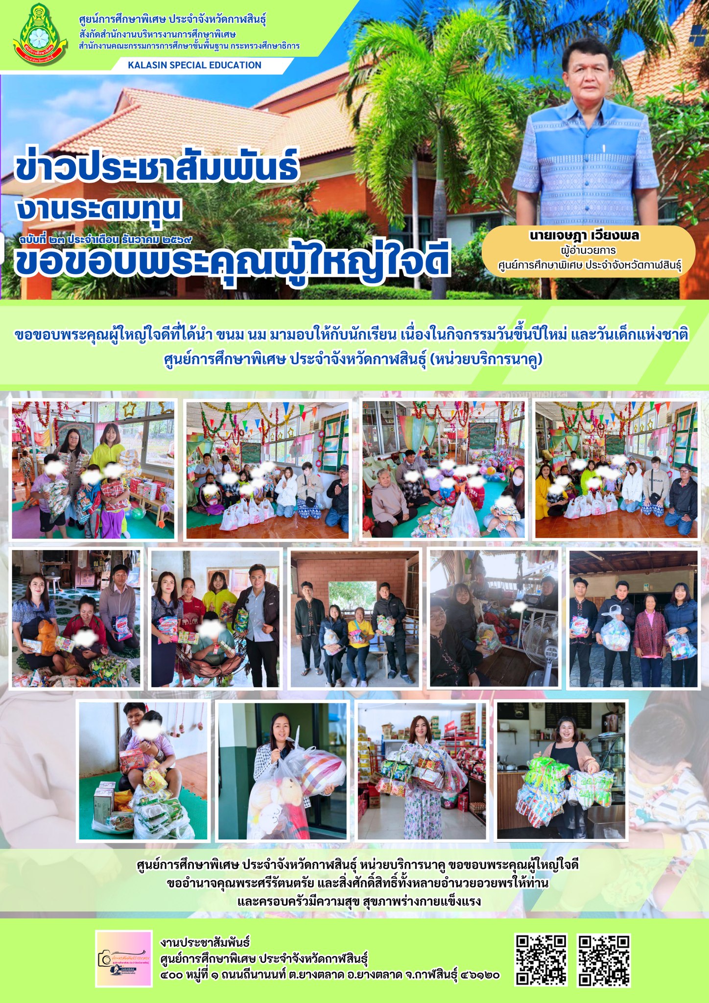 ขอขอบพระคุณผู้ใหญ่ใจดีที่ได้นำ ขนม นม มามอบให้กับนักเรียน เนื่องในกิจกรรมวันขึ้นปีใหม่ และวันเด็กแห่งชาติศูนย์การศึกษาพิเศษ ประจำจังหวัดกาฬสินธ์ุ (หน่วยบริการนาคู)