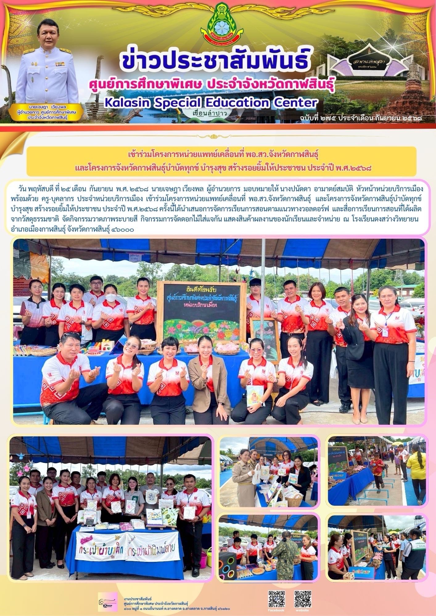 นายเจษฎา เวียงพล ผู้อำนวยการ มอบหมายให้ นางปนัดดา อามาตย์สมบัติ หัวหน้าหน่วยบริการเมือง พร้อมด้วย ครู-บุคลากร ประจำหน่วยบริการเมือง เข้าร่วมโครงการหน่วยแพทย์เคลื่อนที่ พอ.สว.จังหวัดกาฬสินธุ์ และโครงการจังหวัดกาฬสินธุ์บำบัดทุกข์ บำรุงสุข สร้างรอยยิ้มให้ประชาชน ประจำปี พ.ศ.2568 ครั้งนี้ได้นำเสนอการจัดการเรียนการสอนตามแนวทางวอลดอร์ฟ และสื่อการเรียนการสอนที่ได้ผลิต จากวัสดุธรรมชาติ จัดกิจกรรมวาดภาพระบายสี กิจกรรมการจัดดอกไม้ใส่แจกัน แสดงสินค้าผลงานของนักเรียนและจำหน่าย ณ โรงเรียนดงสว่างวิทยายน อำเภอเมืองกาฬสินธุ์ จังหวัดกาฬสินธุ์ 46000