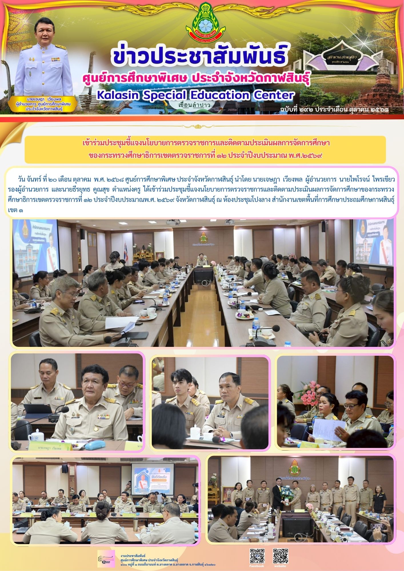 ศูนย์การศึกษาพิเศษ ประจำจังหวัดกาฬสินธุ์ นำโดย นายเจษฎา เวียงพล ผู้อำนวยการ นายไพโรจน์ ไพรเขียว รองผู้อำนวยการ และนายธีรยุทธ คูณสุข ตำแหน่งครู ได้เข้าร่วมประชุมชี้แจงนโยบายการตรวจราชการและติดตามประเมินผลการจัดการศึกษาของกระทรวงศึกษาธิการเขตตรวจราชการที่ 12 ประจำปีงบประมาณพ.ศ. 2569 จังหวัดกาฬสินธุ์ ณ ห้องประชุมโปงลาง สำนักงานเขตพื้นที่การศึกษาประถมศึกษกาฬสินธุ์ เขต 1