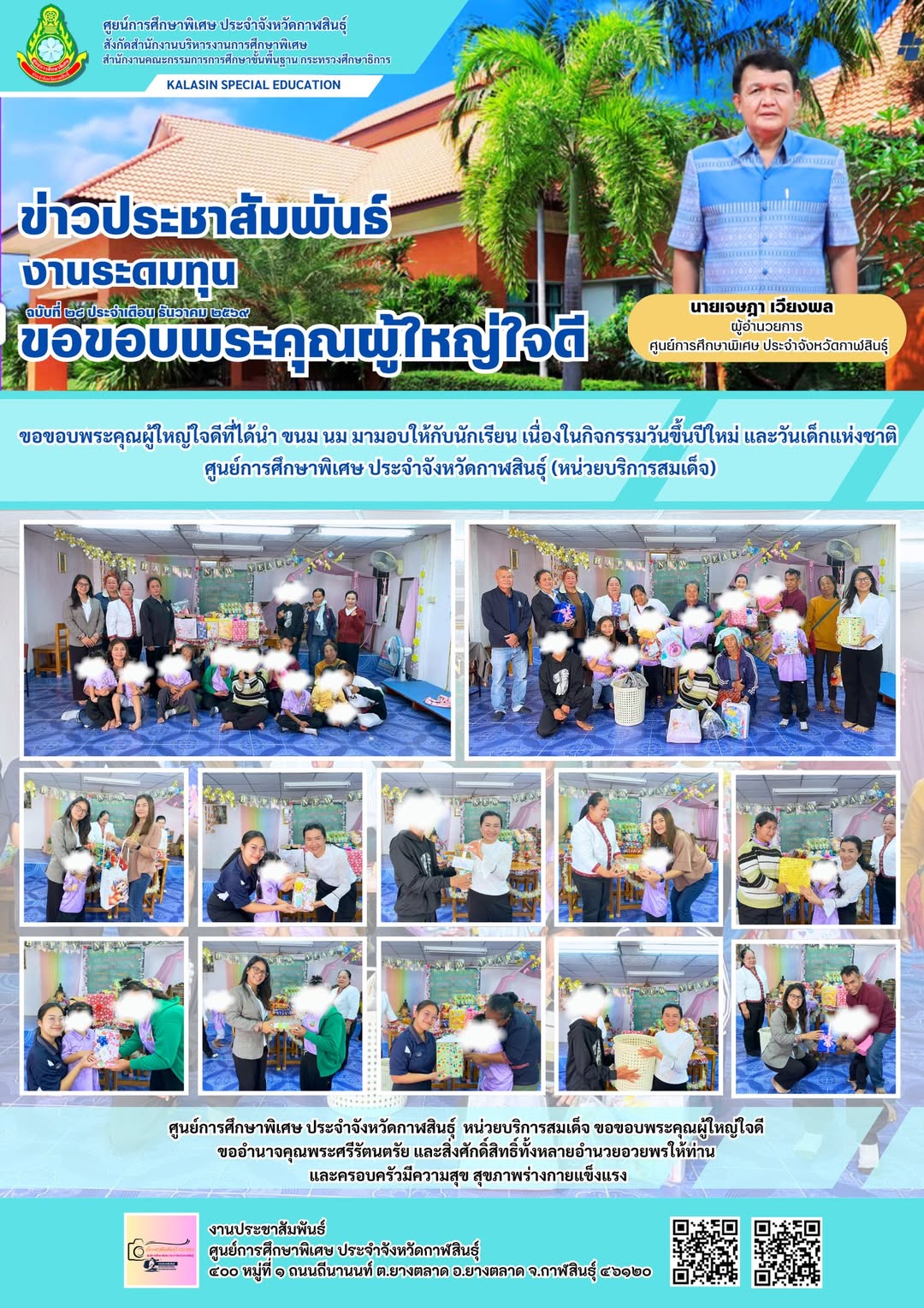 ขอขอบพระคุณผู้ใหญ่ใจดีที่ได้นำ ขนม นม มามอบให้กับนักเรียน เนื่องในกิจกรรมวันขึ้นปีใหม่ และวันเด็กแห่งชาติศูนย์การศึกษาพิเศษ ประจำจังหวัดกาฬสินธ์ุ (หน่วยบริการสมเด็จ)