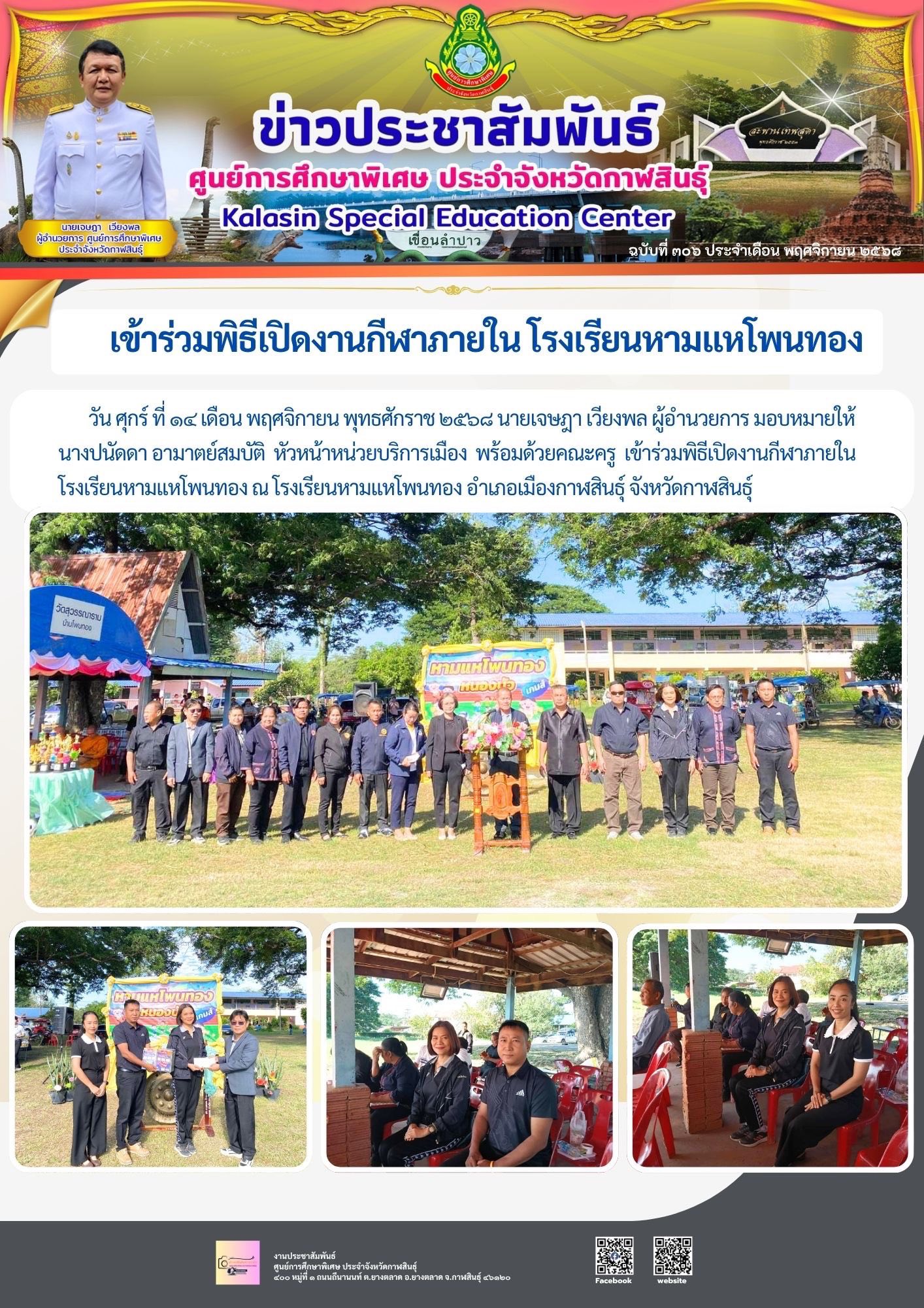 วัน ศุกร์ ที่ 14 เดือน พฤศจิกายน พุทธศักราช 2568 นางปนัดดา อามาตย์สมบัติ หัวหน้าหน่วยบริการเมือง พร้อมด้วยคณะครู เข้าร่วมพิธีเปิดงานกีฬาภายใน โรงเรียนหามแหโพนทอง ณ โรงเรียนหามแหโพนทอง อำเภอเมืองกาฬสินธุ์ จังหวัดกาฬสินธุ์